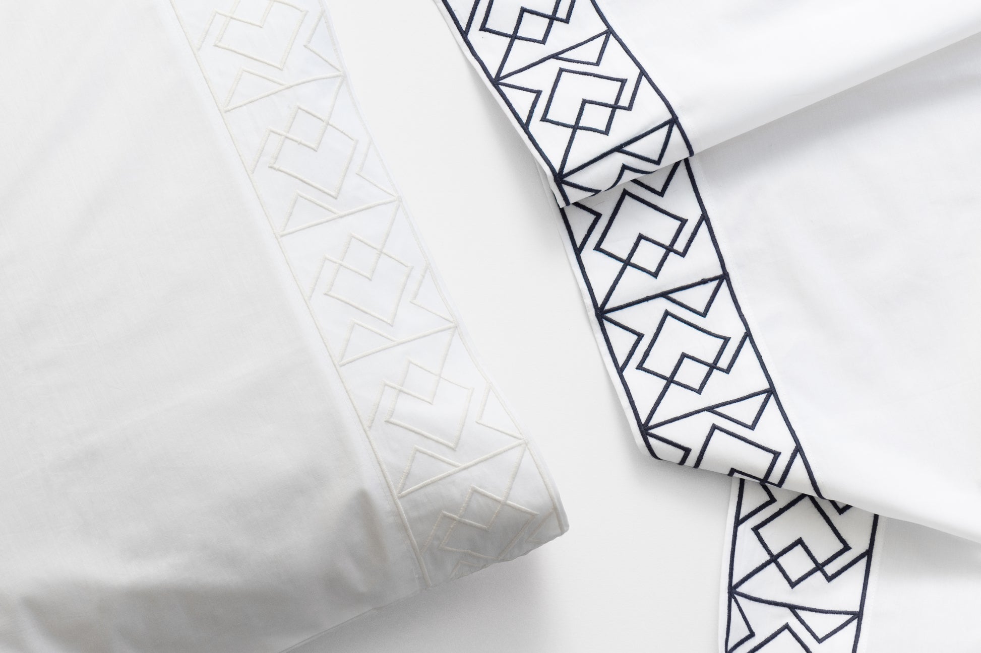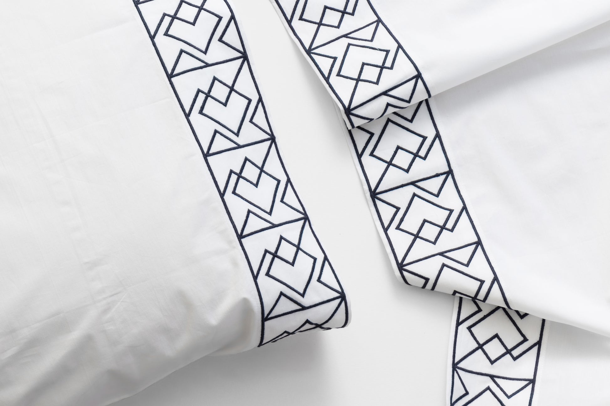 The Commune for Hamburg House bedding collection is made of 100% Egyptian cottons and Italian linen, intricately embroidered in our signature patterns. The collection celebrates the California lifestyle, with a mix of Native American aesthetics and a nod to the Bauhaus design movement. Hamburg House is a family owned, high-quality bedding company based in Florida.