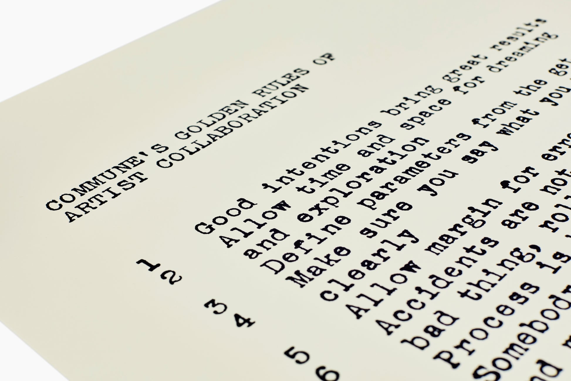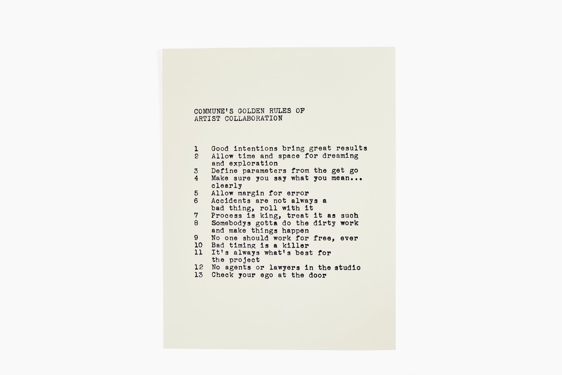 Commune's Golden Rules of Artist Collaboration. Printed by Aardvark Letterpress on 118# natural white cotton paper with custom type and ink.