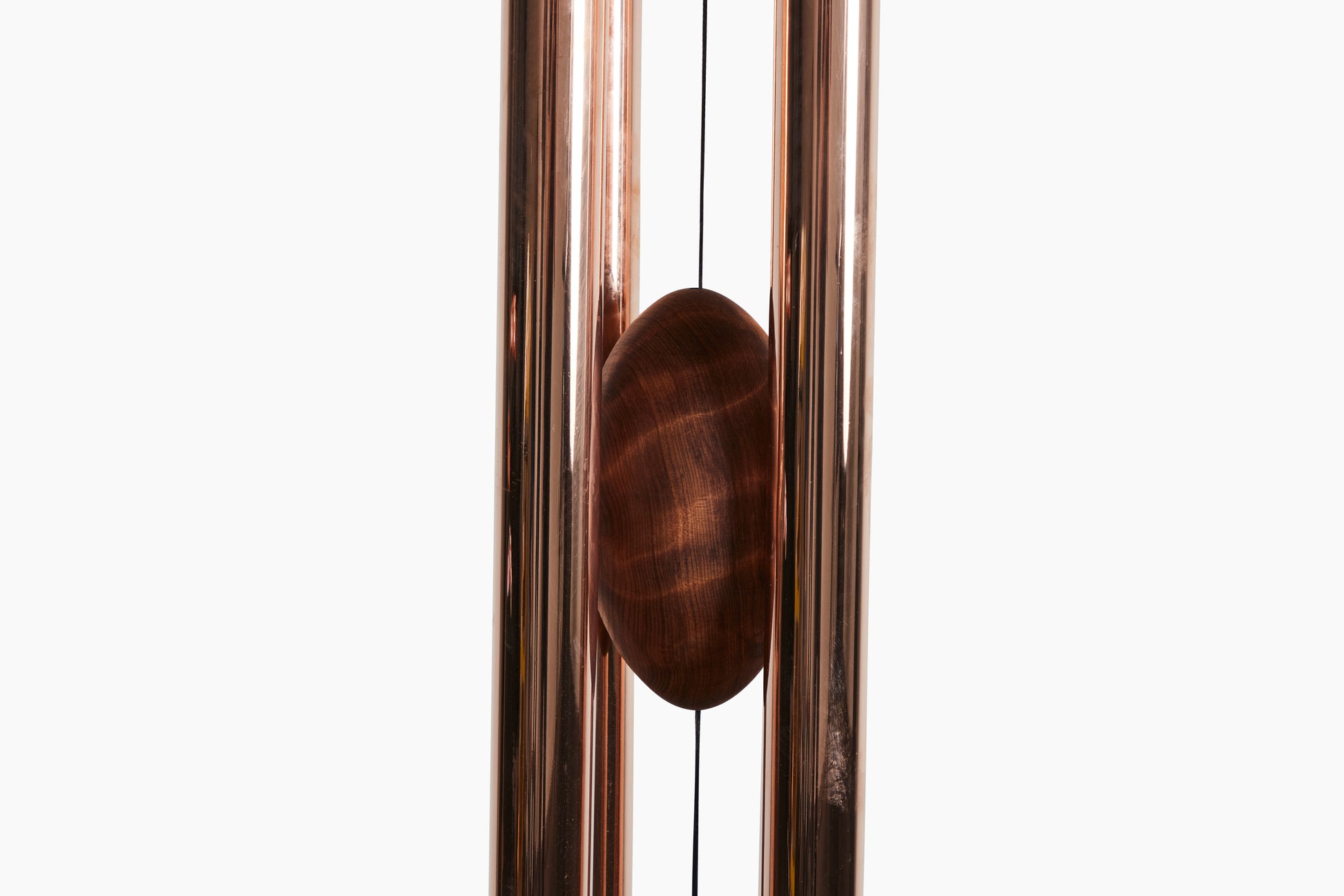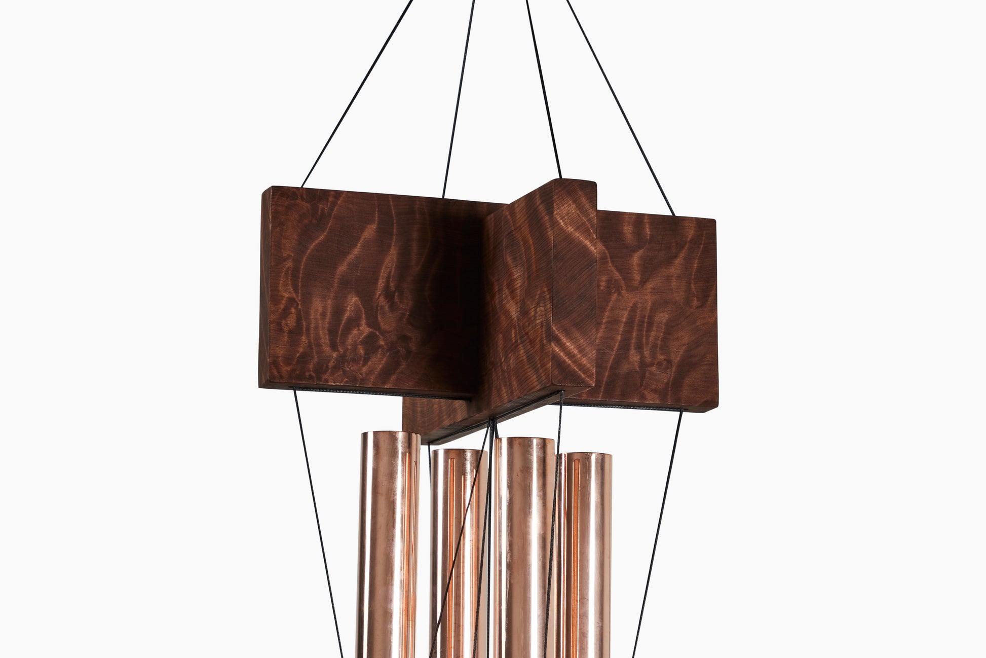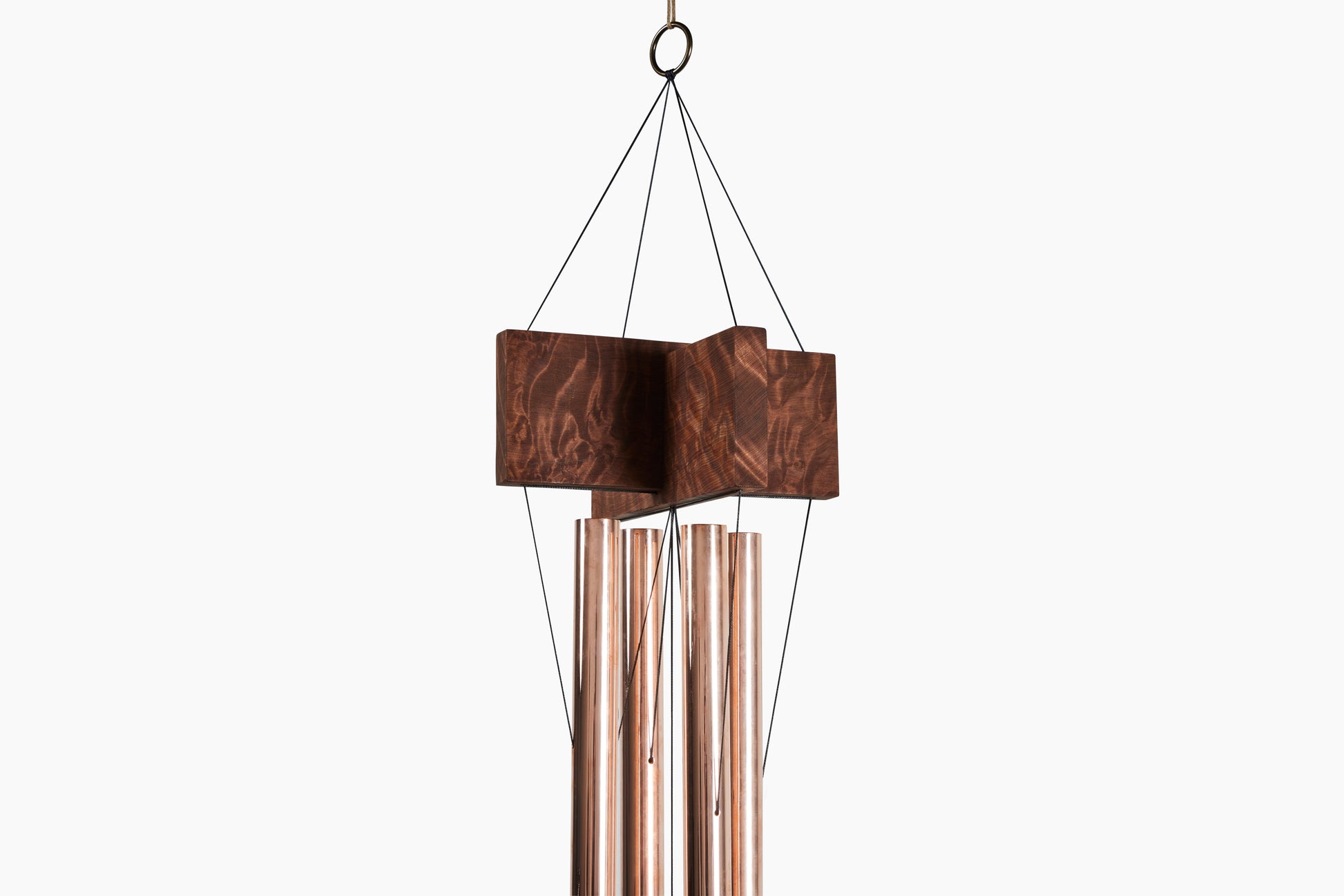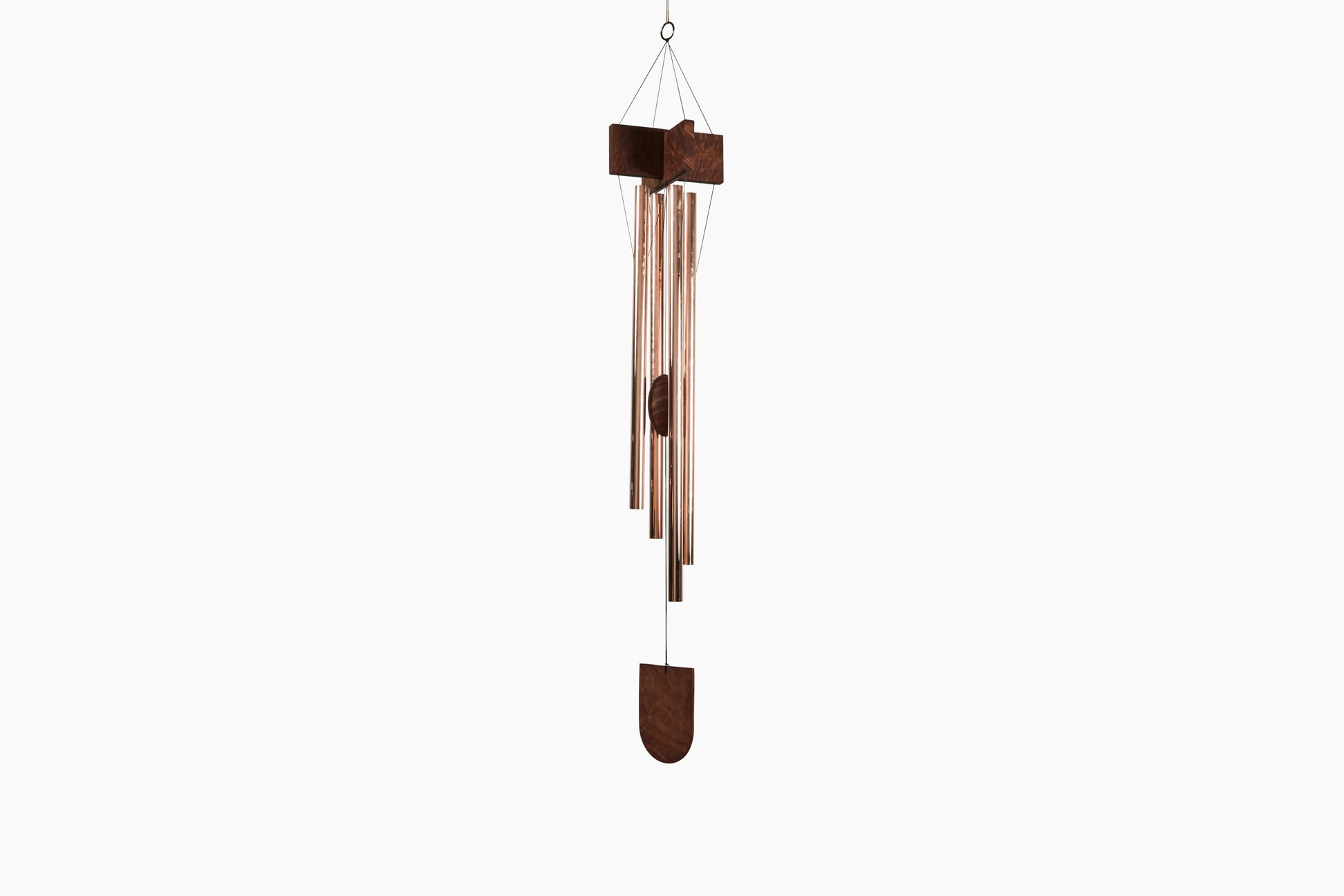 Musician and artist Chris Kallmyer, has embarked to redesign the sounds of the home. This wind chime is part of Chris' ongoing investigation into sounding home goods - a collection of furniture made to intone atmospheric music and breezy melodies that promote social well-being through sound.