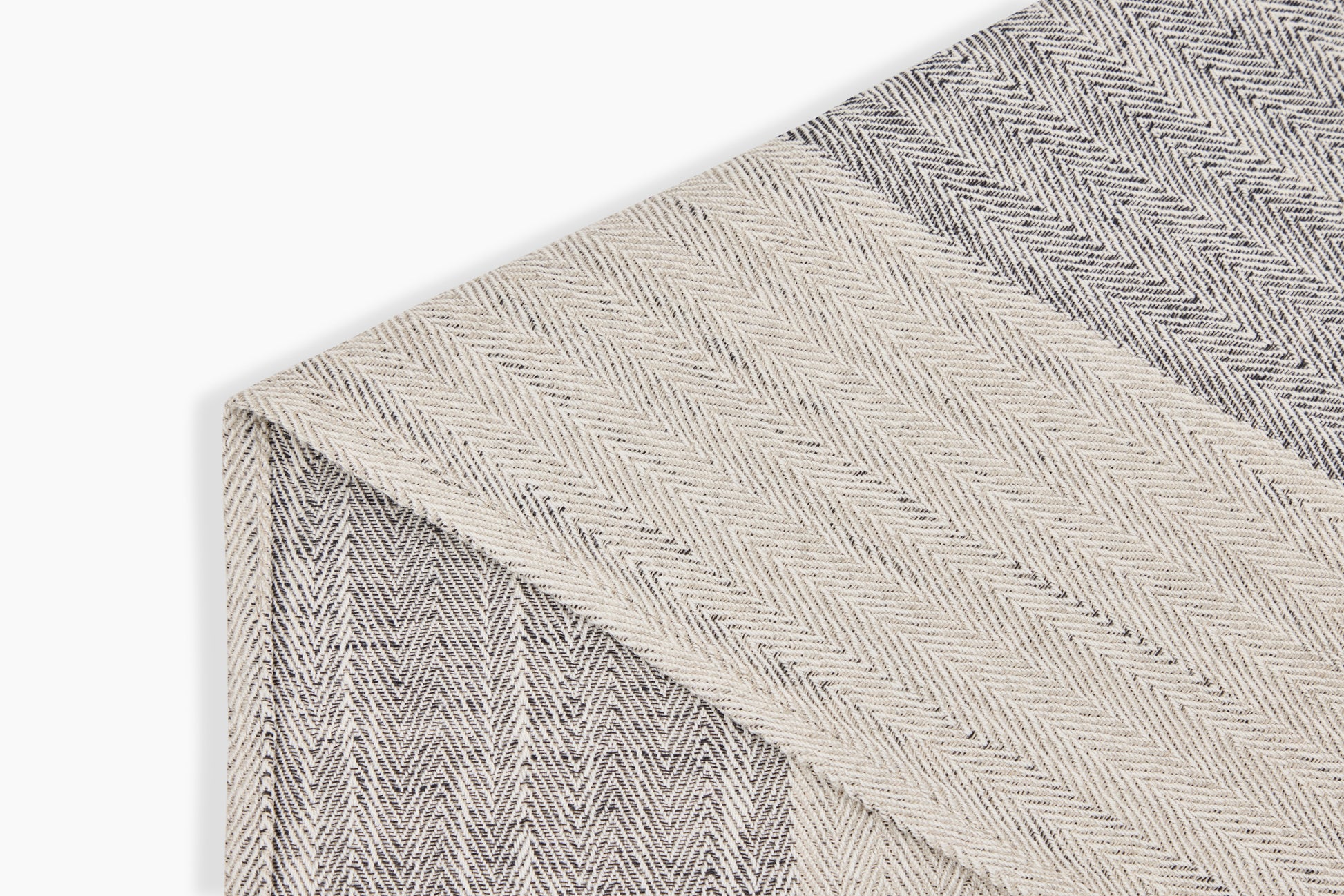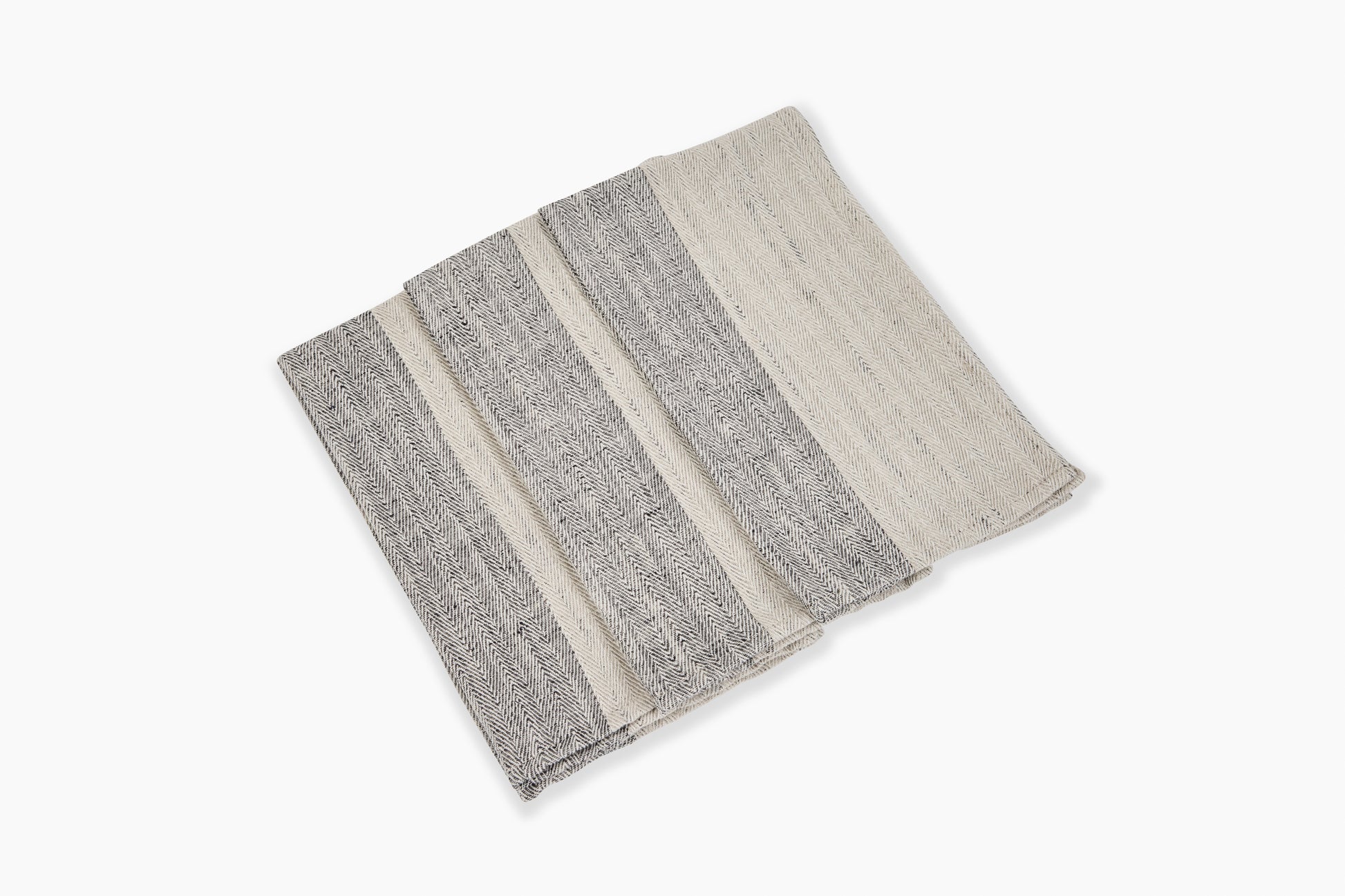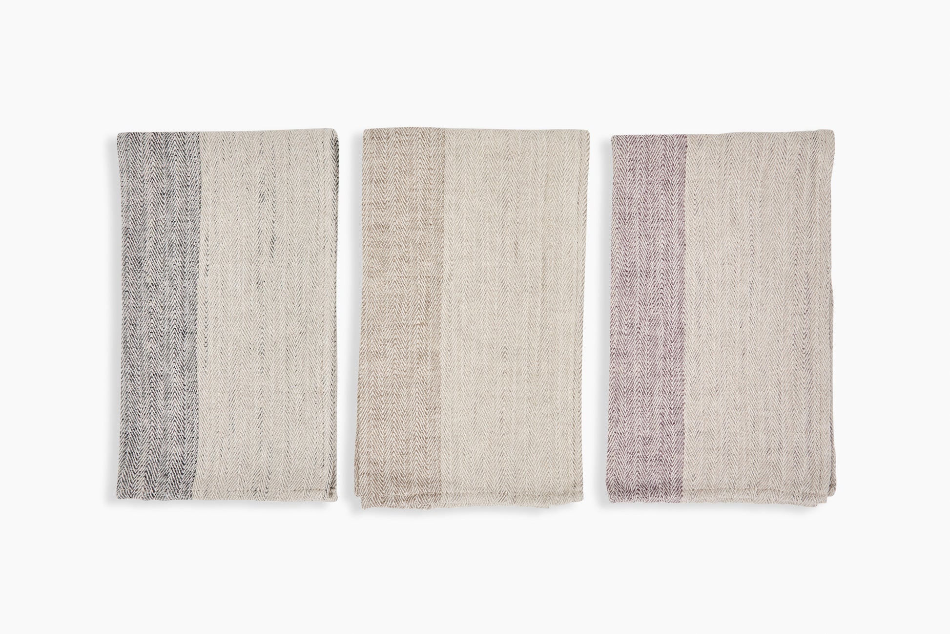 These carefully-sized rectangular linen and cotton towels have been loomed on a natural-colored warp with a wide jacquard weft stripe in three colors: brown, purple or anthracite. Each towel has a linen loop sewn along the long edge for convenient hanging. They're also nicely stacked in a pile.