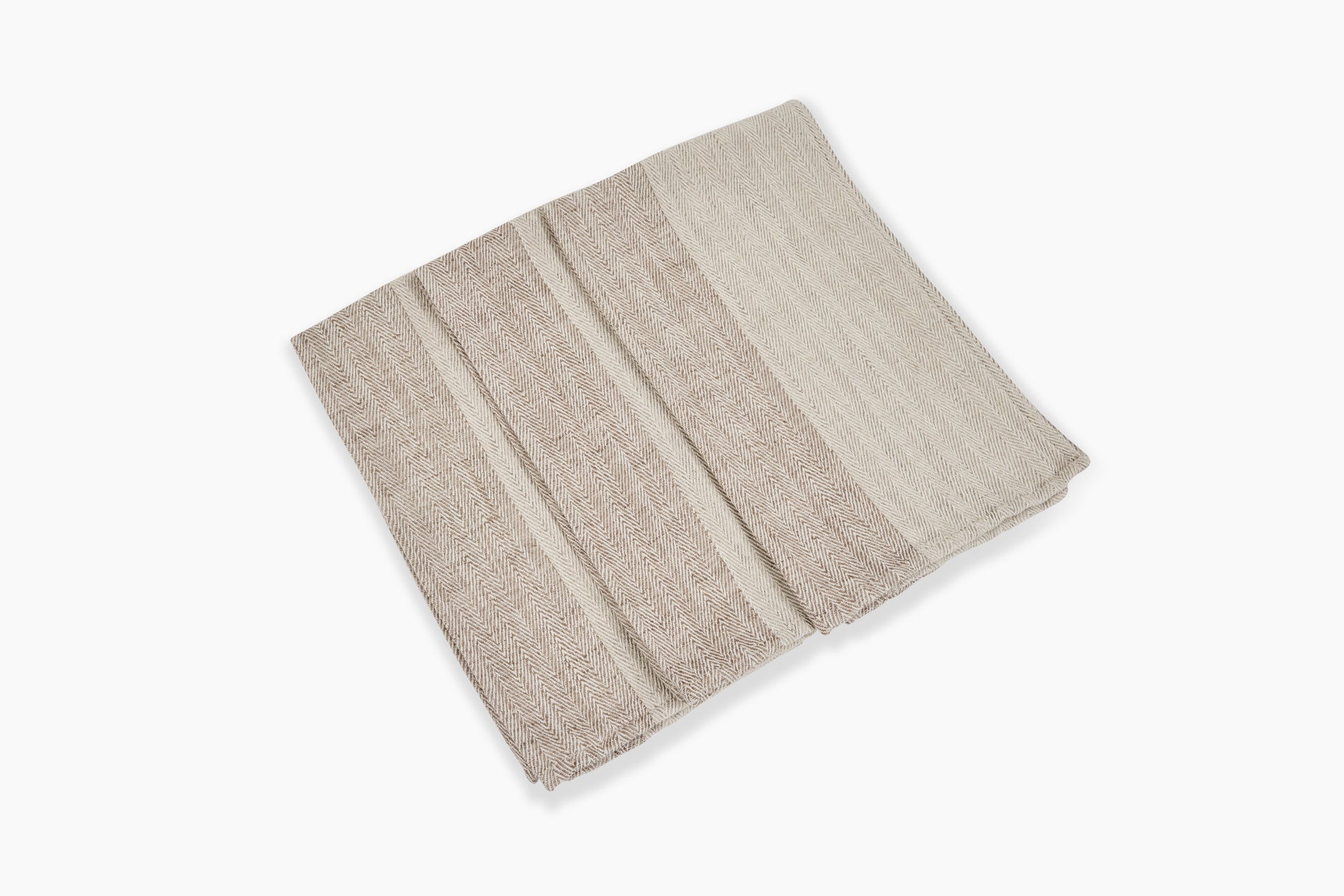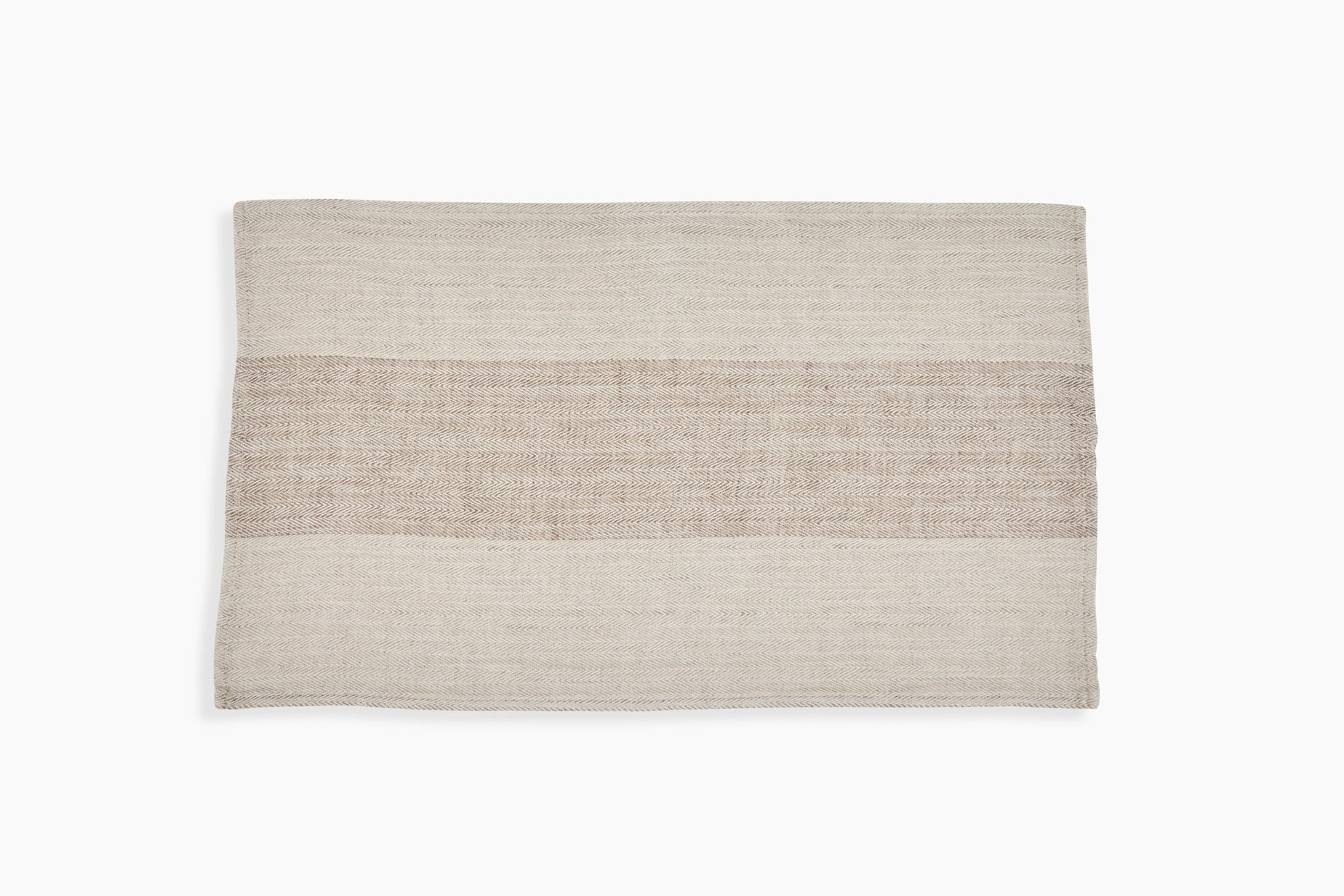 These carefully-sized rectangular linen and cotton towels have been loomed on a natural-colored warp with a wide jacquard weft stripe in three colors: brown, purple or anthracite. Each towel has a linen loop sewn along the long edge for convenient hanging. They're also nicely stacked in a pile.
