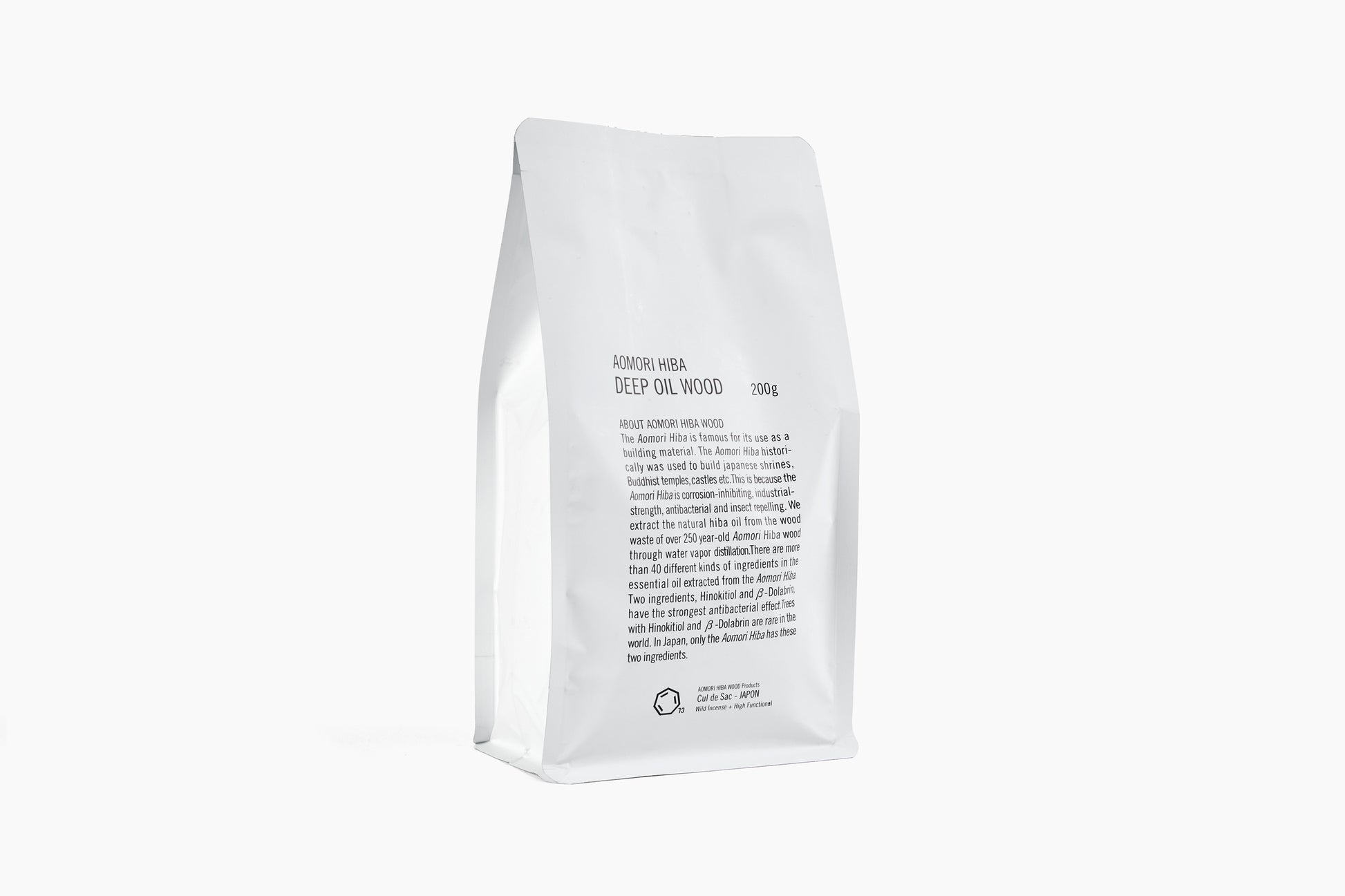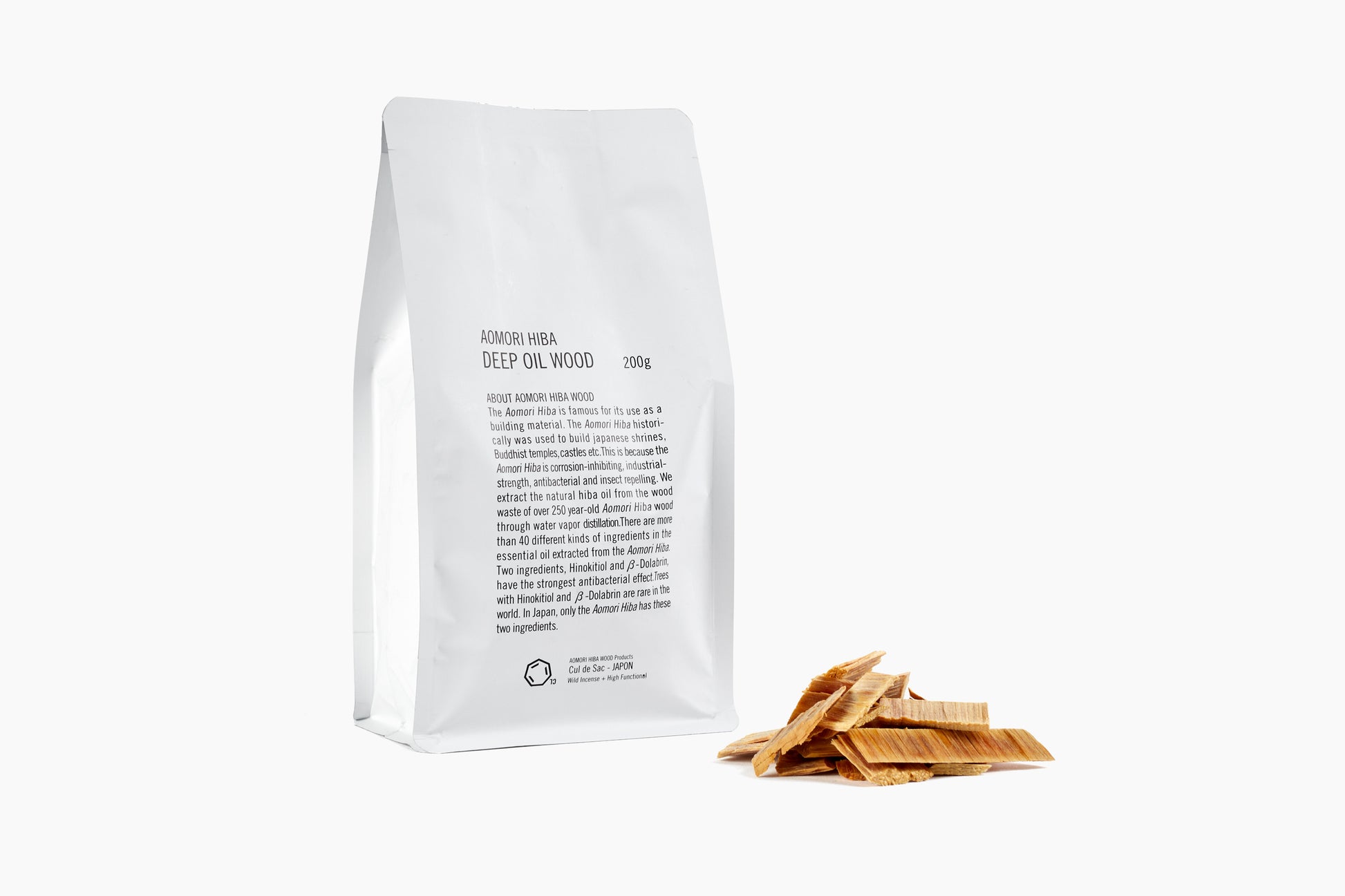 Cul de Sac - JAPON extracts the natural oil from over 250 year-old Aomori Hiba wood waste through water vapor distillation. These wood chips are created with the hope that people will feel the comfort and efficacy of the gentle woodsy scent of hiba. Aomori Hiba was historically used to build Japanese shrines, Buddhist temples, castles, etc. due to its corrosion-inhibiting, industrial strength, antibacterial and insect repelling qualities.