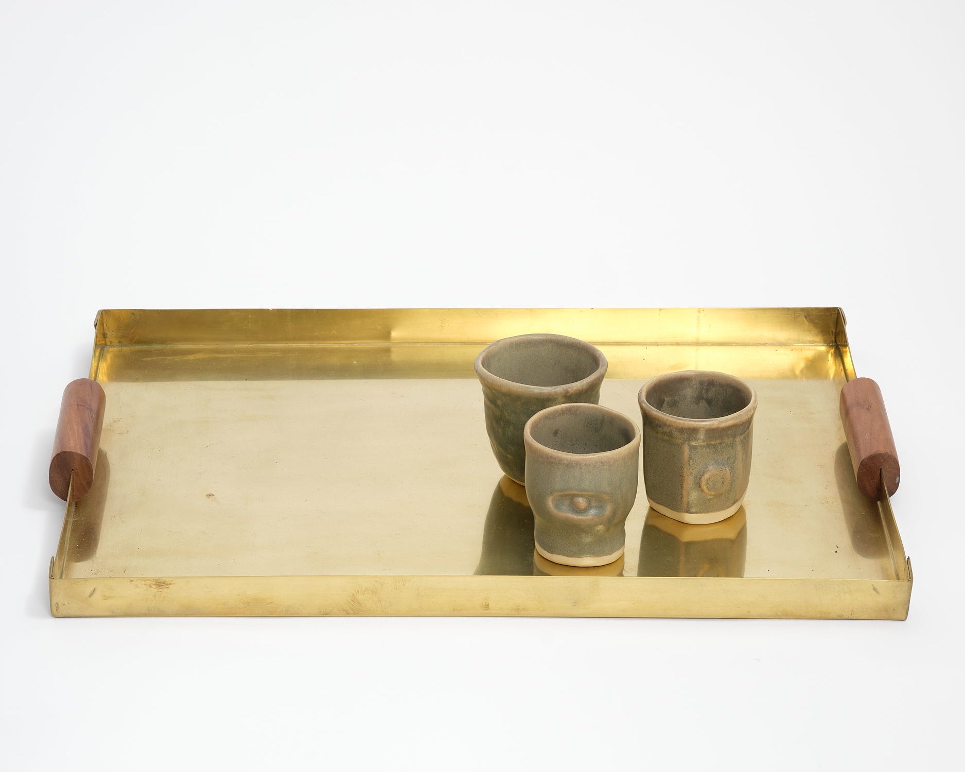 Though JB Blunk was known for moving fluidly between materials and disciplines, this handmade brass tray is a reproduction of Blunk’s only known work in brass. A very early work from the late 1950s or early 1960s, its straightforward utilitarian directness is counterbalanced with delicate, precise corner folds and beautifully rendered wooden handles. The original tray was a well-loved object in the Blunk House, used for weekend breakfasts in bed, flamboyant desserts of rum-soaked raisins set on fire, and tea ceremonies with friends in the shaded gravel zen garden in front of the Blunk House.