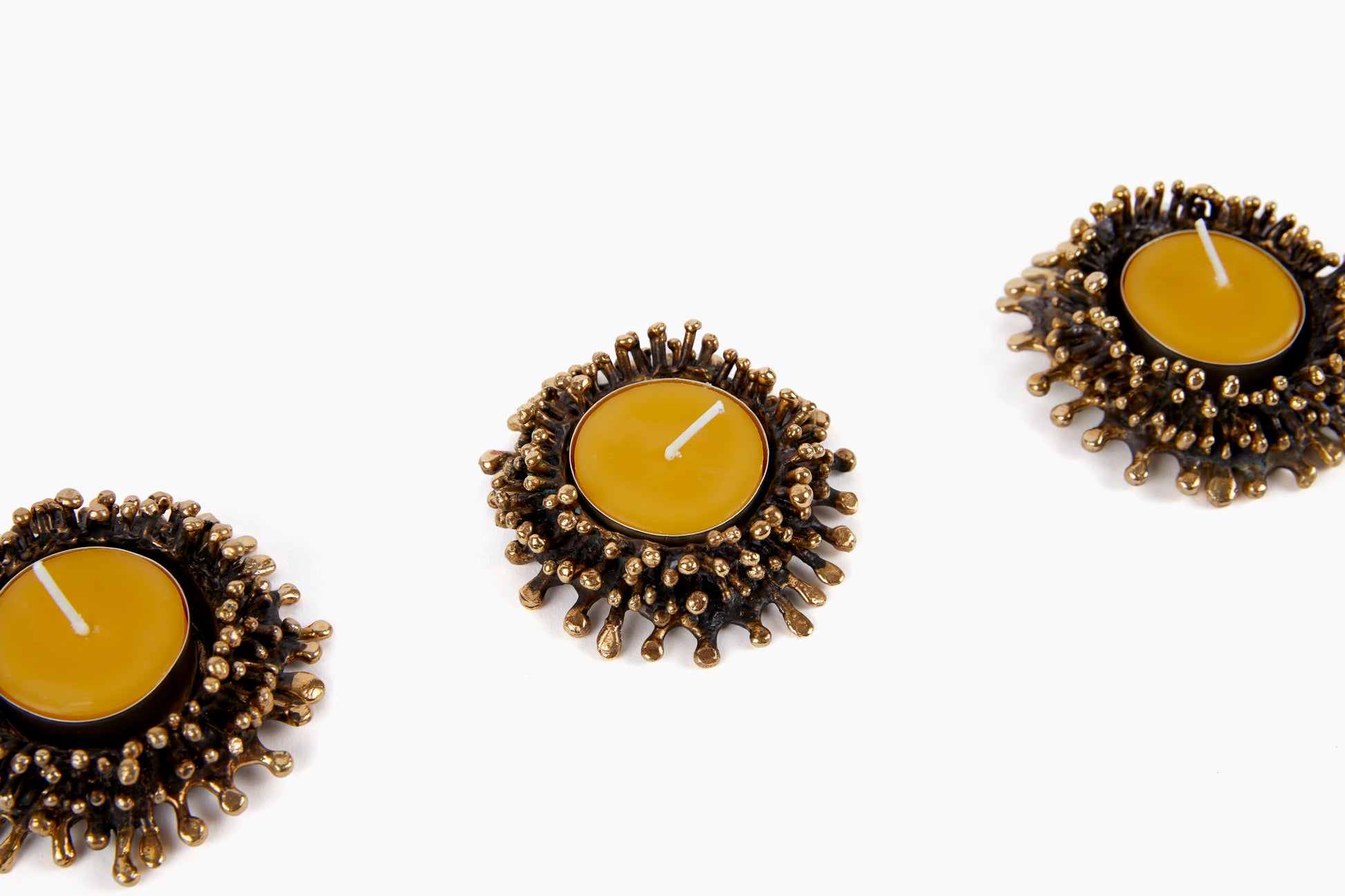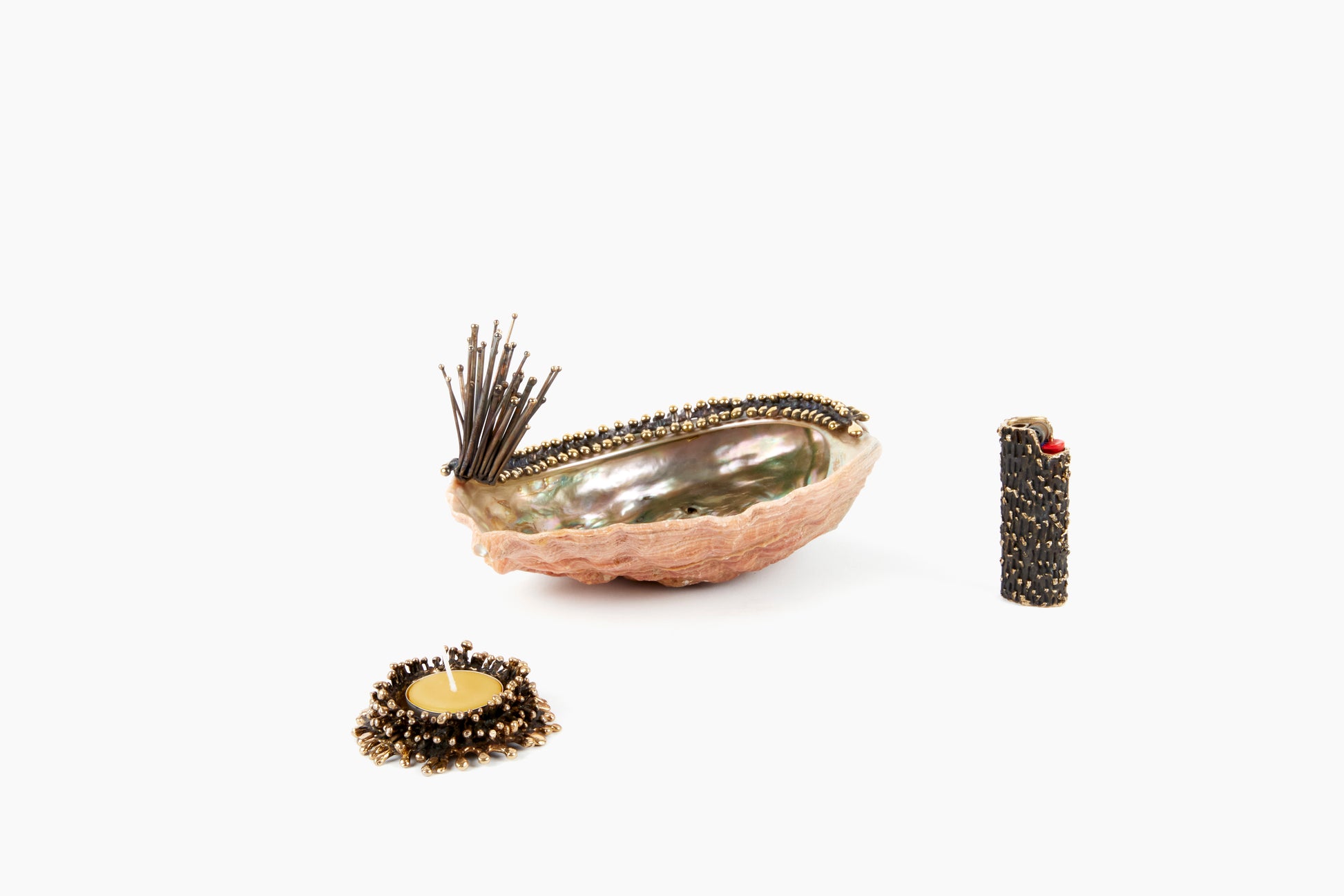 Lisa Eisner has always been inspired by 1970's artist studio pieces, "often these artists worked in bronze and made unique one-of-a-kind jewelry pieces that were almost like little sculptures", and has created her own collection of little sculptures exclusively for Commune. Lisa's signature spore design, reminiscent of a sea urchin, is now fashioned into a beautiful votive made to hold any standard tea light. Made in blackened bronze using a lost wax casting technique.