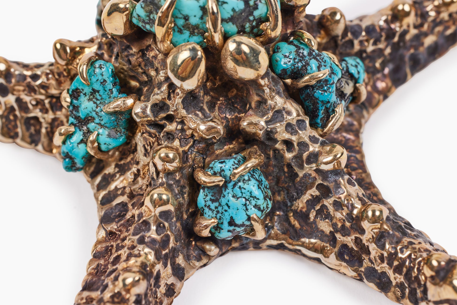 Inspired by 1970's artist studio pieces and nature, Lisa Eisner created a unique, handmade, and one-of-a-kind collection of small blackened bronze jewelry starfish sculptures with Kingman Turquoise or blue Azurite Nuggets.