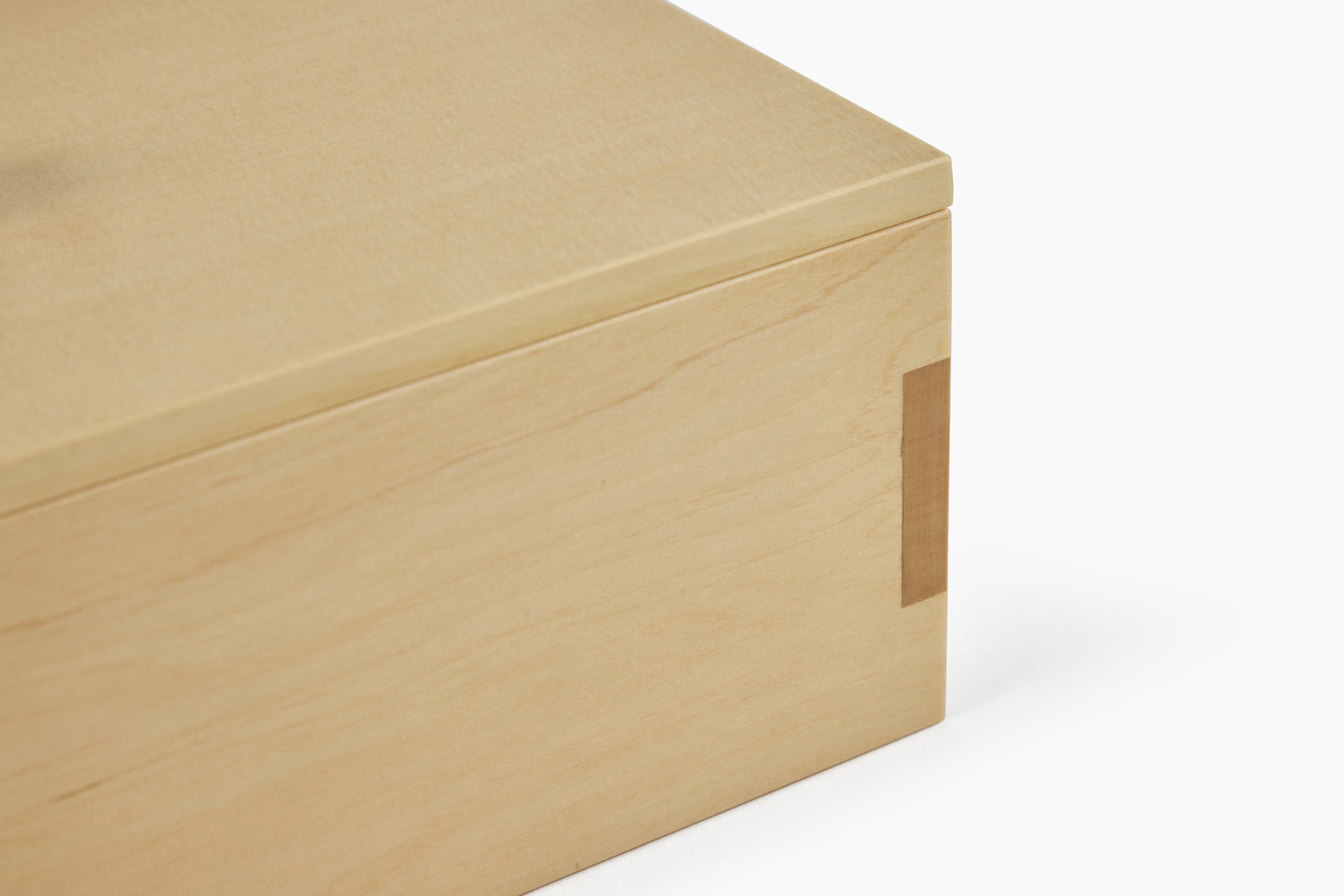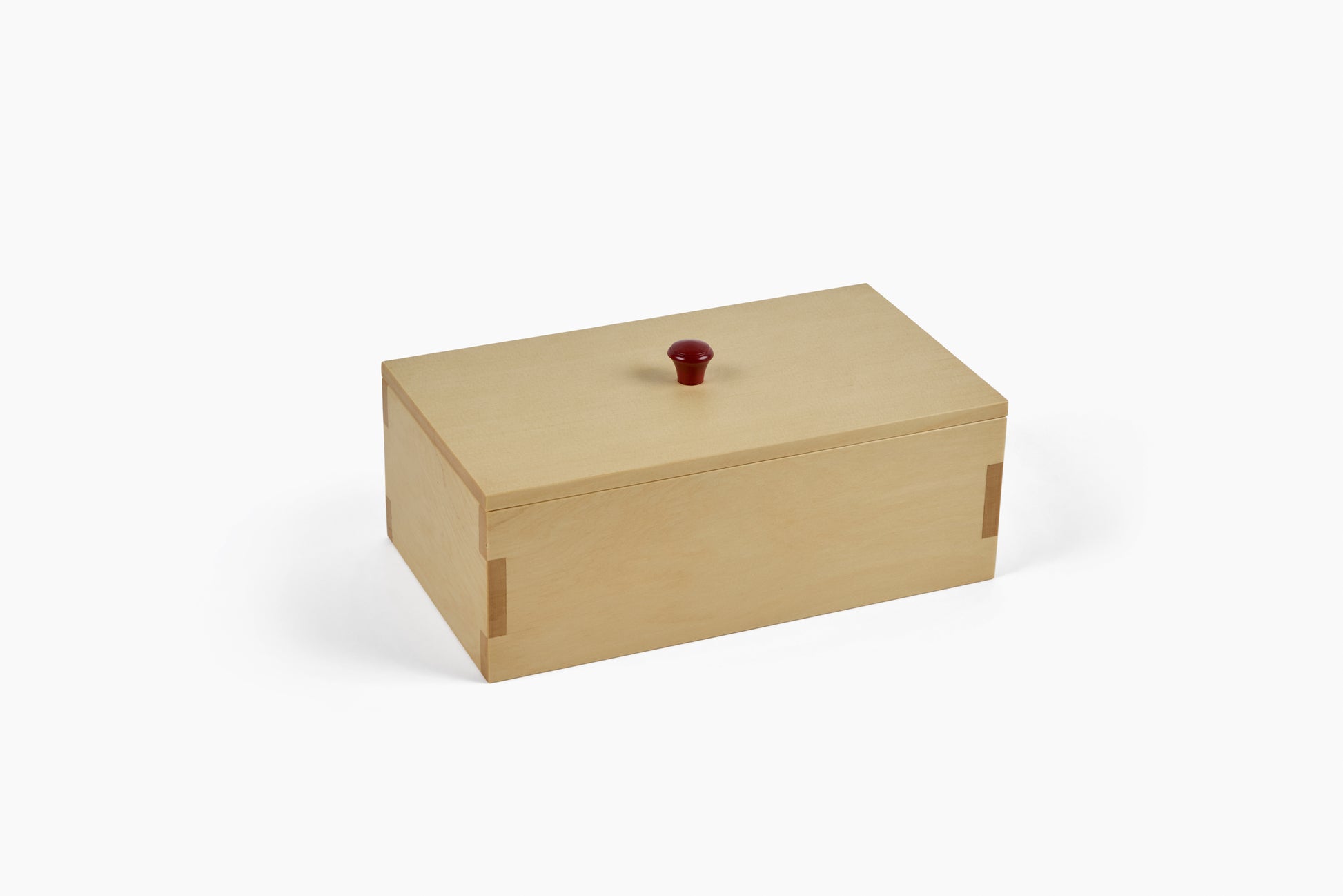 This particular box is made of Alaskan yellow cedar. About this box Noah shared, "The wood came from a small chunk of very tight grain Alaskan yellow cedar I bought around 2010 in Humboldt County. Subtle and delicate, I wanted to keep this box clean and minimal to let the subtle beauty and aroma of the cedar come through." The red bakelite knob is an antique.