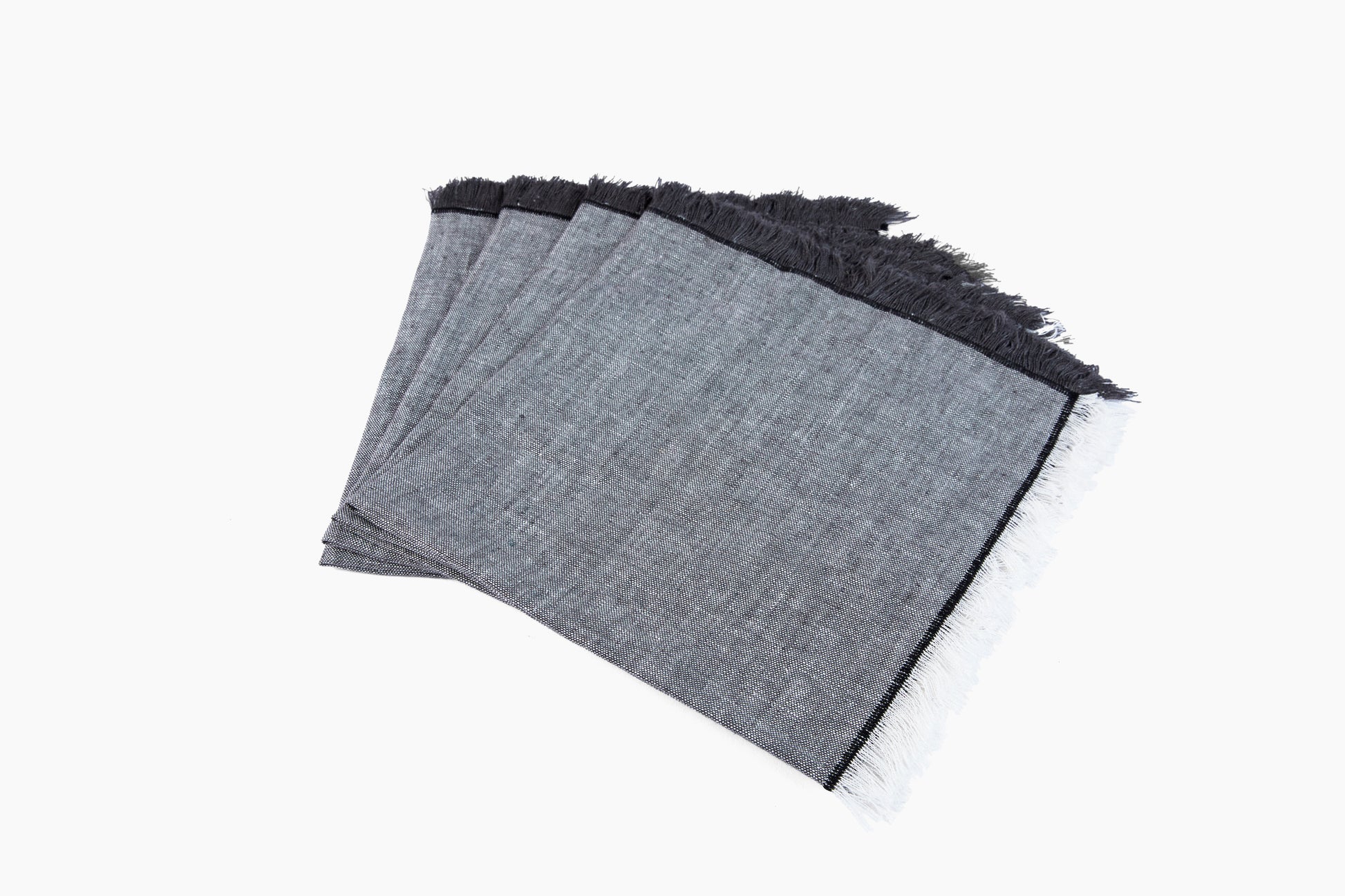 Designed in collaboration with Peter Speliopoulos and handcrafted in New York of Italian Linen. These napkins are made of a beautiful gray weft and white warp with a fringe edge. They live handsomely amongst our collaborative leather napkin rings and placemats.