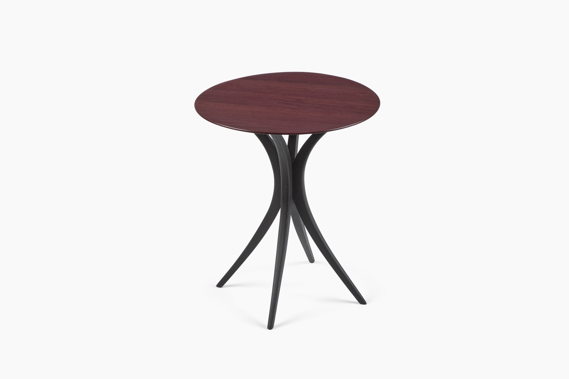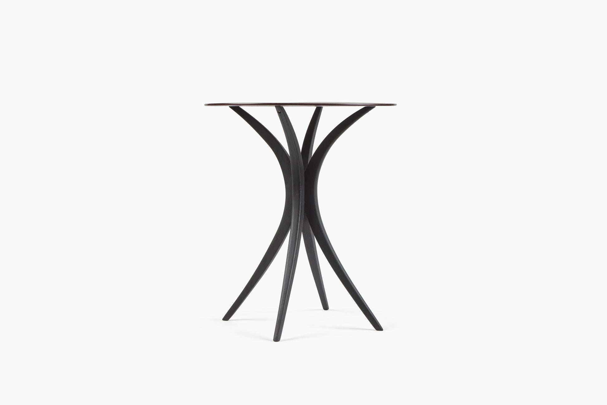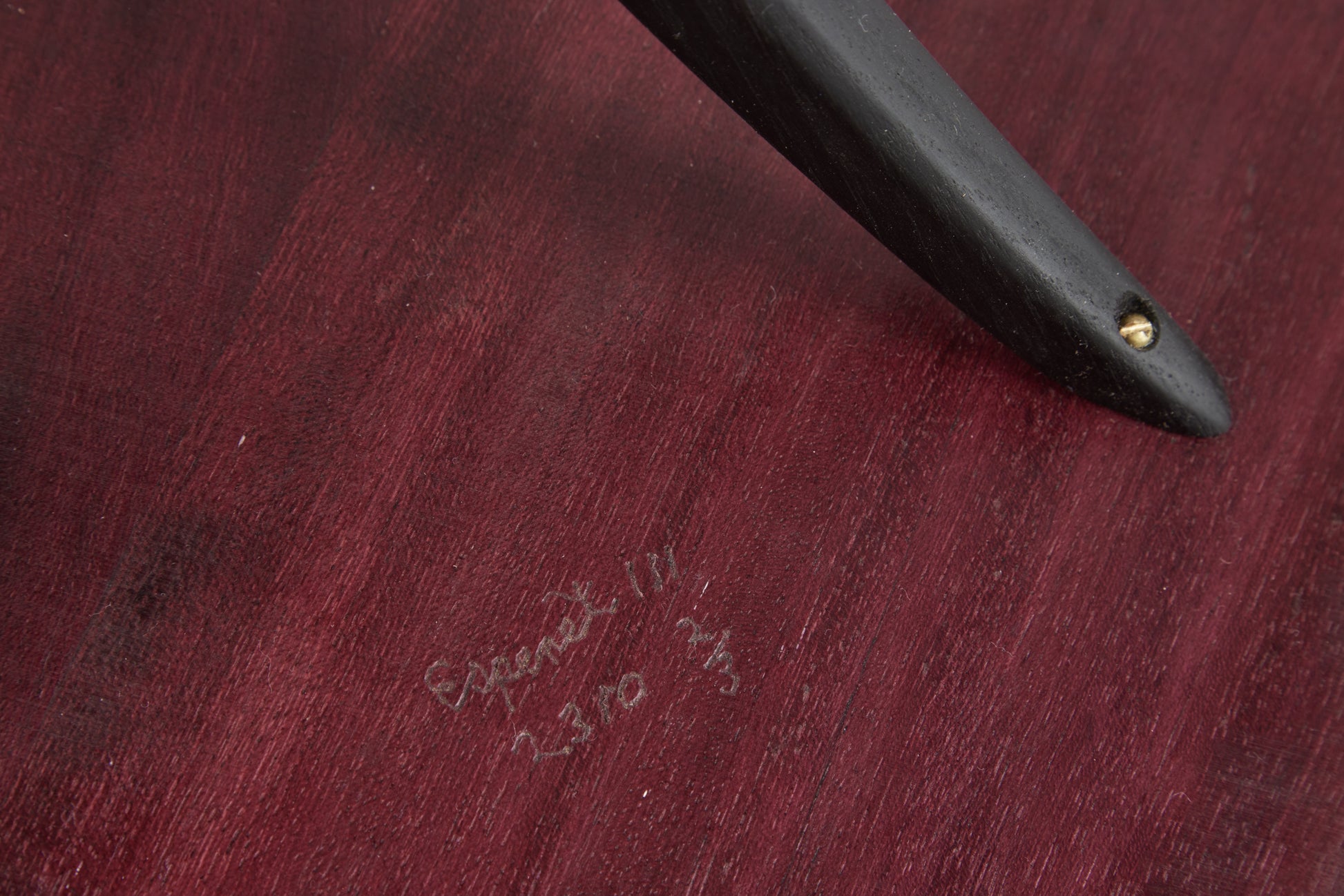Tripp Carpenter has worked with wood since he was a child in Northern California with his self-taught father, Art Espenet Carpenter, a prolific and iconic furniture designer and woodworker. We've been lucky to acquire a grouping of Tripp's one of a kind smaller works. Each work is hand made, signed and numbered. This particular table is delicately crafted with Purpleheart.