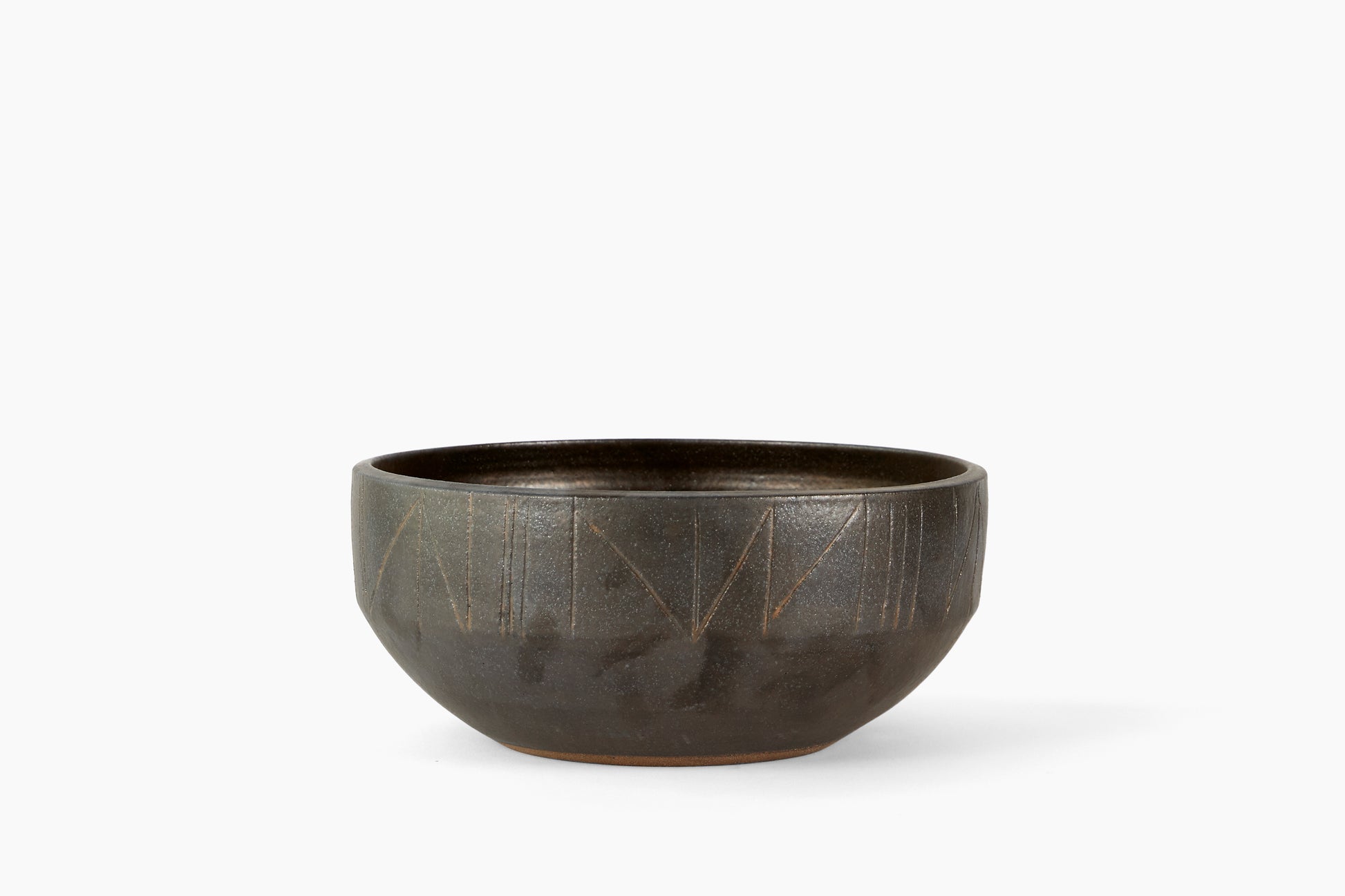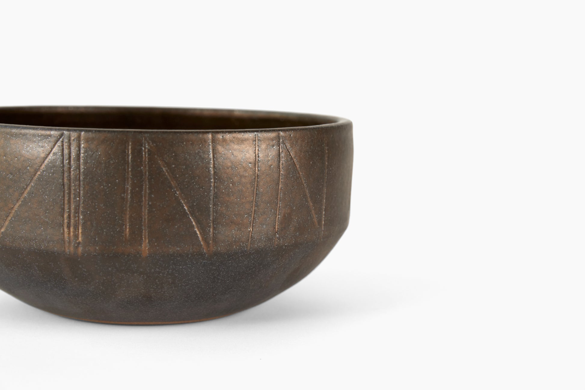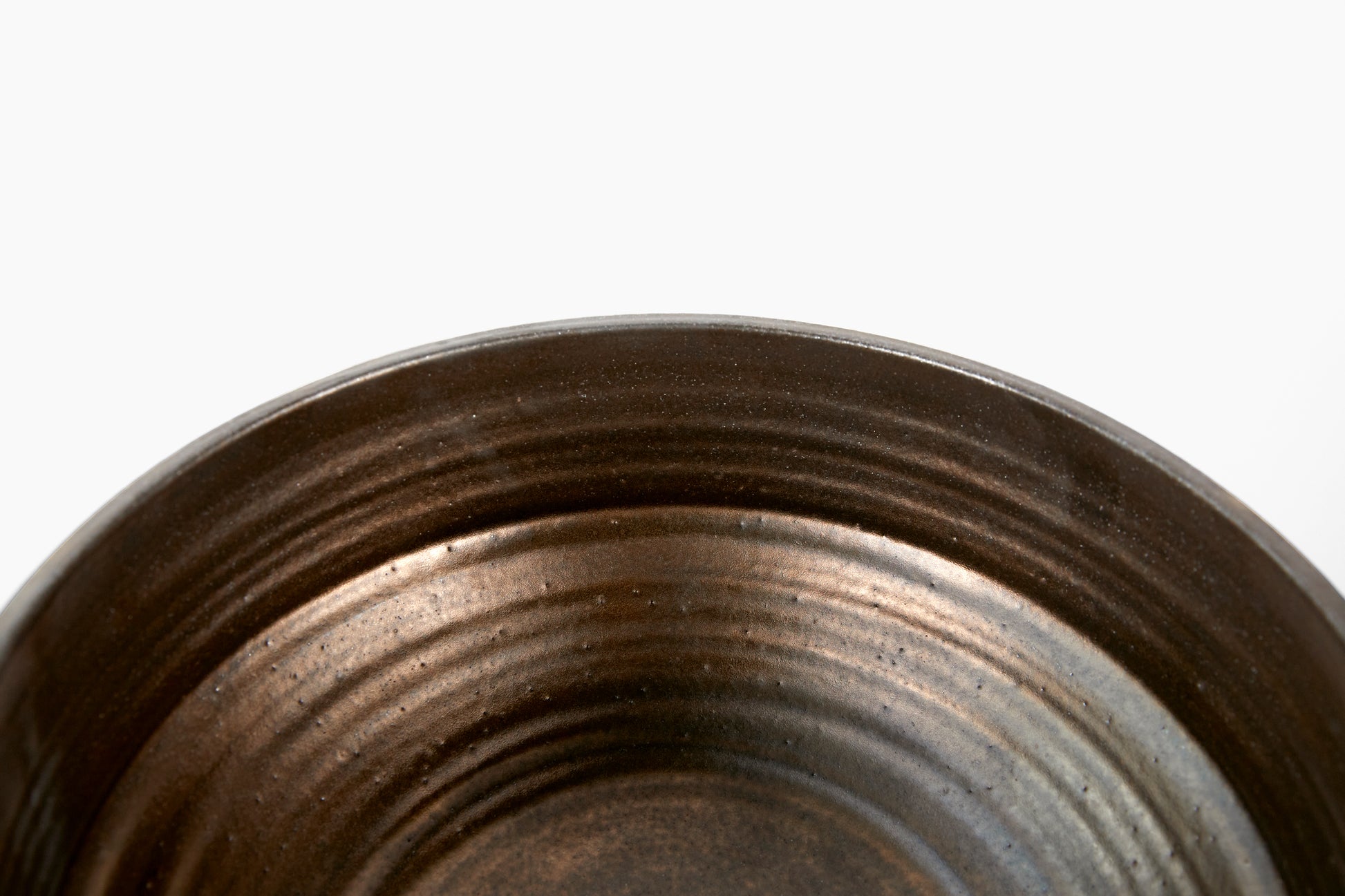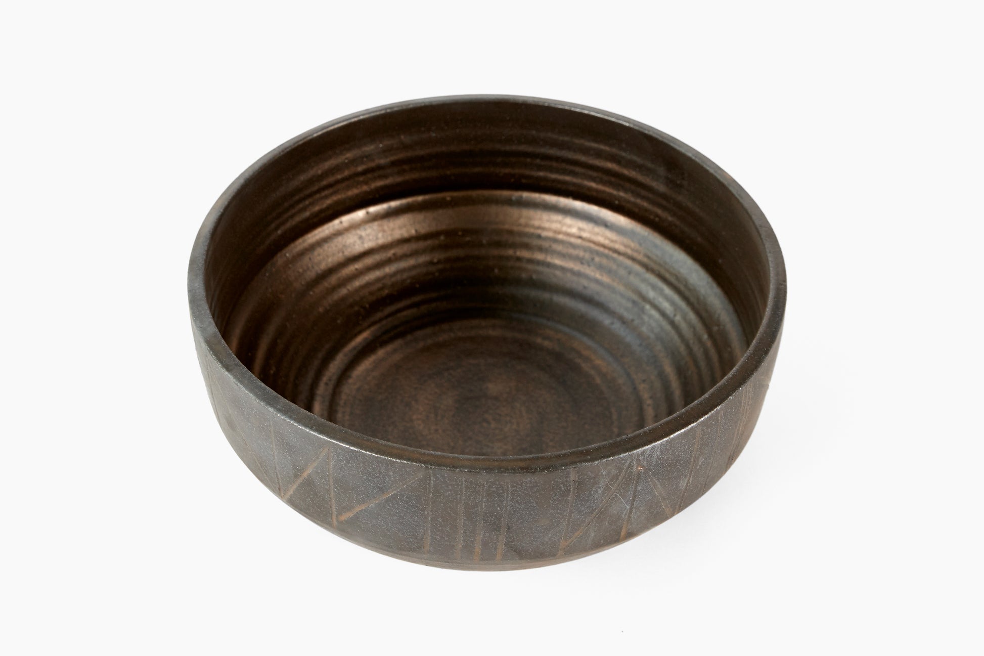 Hand thrown by VM, each bowl is hand carved with a unique pattern. The glaze is a rustic yet modern brown gloss glaze with golden highlights. This is the perfect serving bowl or decorative piece.